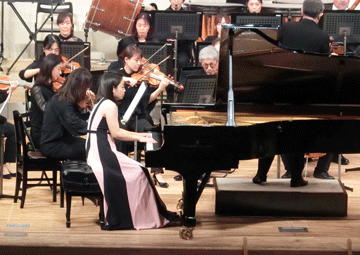 続いては、同校の講師でもある生熊茜さんをソリストに迎えサン=サーンスのピアノ協奏曲第5番「エジプト風」を演奏。生熊さんは、第1楽章は旅情あふれるように、第2楽章はエキゾチックな雰囲気が漂うように、第3楽章は圧倒的なエネルギーを放つように、といずれの楽章も活き活きと演奏してくださいました。